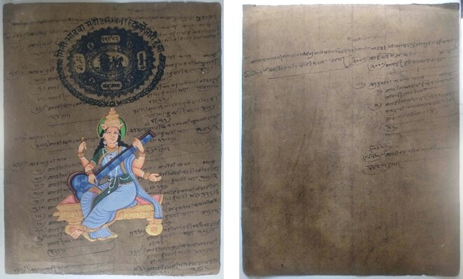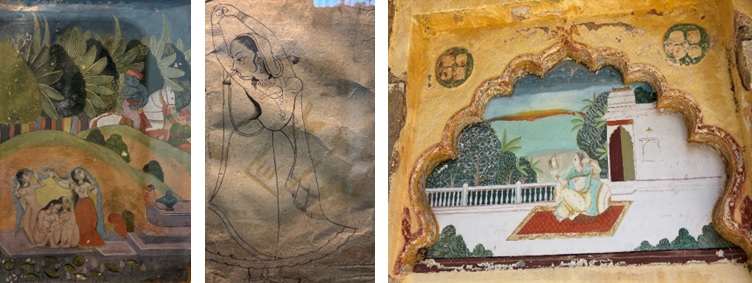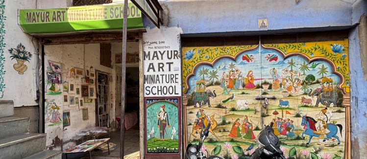 इनसे मैंने एक सरस्वती जी का चित्र खरीदा। एक और मजेदार चीज लगी कि जिस कागज पर ये लोग चित्र उकेरते हैं वो उन्होंने एंटीक फीलिंग देने के लिए पुराने स्टांप पेपर या रियासत के जमाने के बही खातों के पुराने पेपर के ऊपर चित्र को उकेरते हैं। लेकिन खैनी या तंबाकू खाने की आदत तो भारत में बहुत बुरी है। ये बंदा बात नहीं कर पा रहा था उसके मुंह में पीक भरी हुई थी। उसको उठके जाना पड़ा पीक को थूकने के लिए और फिर वो आके चलकर मुझसे बात कर पाया।